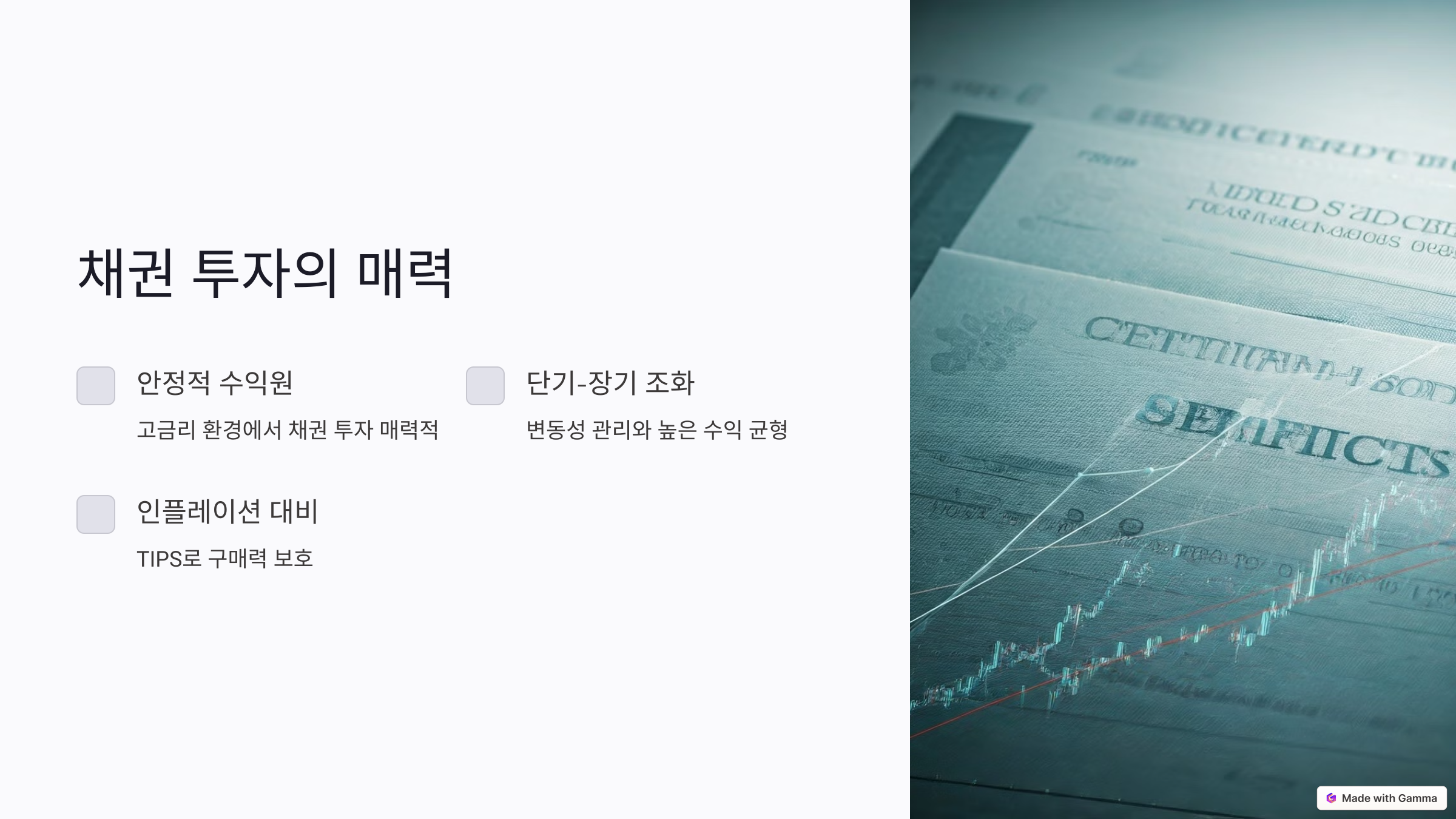 ๊ณ ๊ธˆ๋ฆฌ ํ™˜๊ฒฝ์—์„œ๋Š” ์ฑ„๊ถŒ ํˆฌ์ž๊ฐ€ ๋งค๋ ฅ์ ์ธ ์„ ํƒ์ง€๋กœ ๋– ์˜ค๋ฆ…๋‹ˆ๋‹ค. ๊ธˆ๋ฆฌ๊ฐ€ ์ƒ์Šนํ•˜๋ฉด ์‹ ๊ทœ ๋ฐœํ–‰๋˜๋Š” ์ฑ„๊ถŒ์€ ๋” ๋†’์€ ์ด์ž์œจ์„ ์ œ๊ณตํ•˜๋ฏ€๋กœ ์•ˆ์ •์ ์ธ ์ˆ˜์ต์„ ์›ํ•˜๋Š” ํˆฌ์ž์ž๋“ค์—๊ฒŒ ์œ ๋ฆฌํ•ฉ๋‹ˆ๋‹ค. ํŠนํžˆ, ๊ตญ์ฑ„์™€ ๊ฐ™์€ ์ €์œ„ํ—˜ ์ฑ„๊ถŒ์€ ๊ฒฝ๊ธฐ ๋ถˆํ™•์‹ค์„ฑ์ด ํด ๋•Œ ์•ˆ์ „ ์ž์‚ฐ์œผ๋กœ ์„ ํ˜ธ๋ฉ๋‹ˆ๋‹ค.
