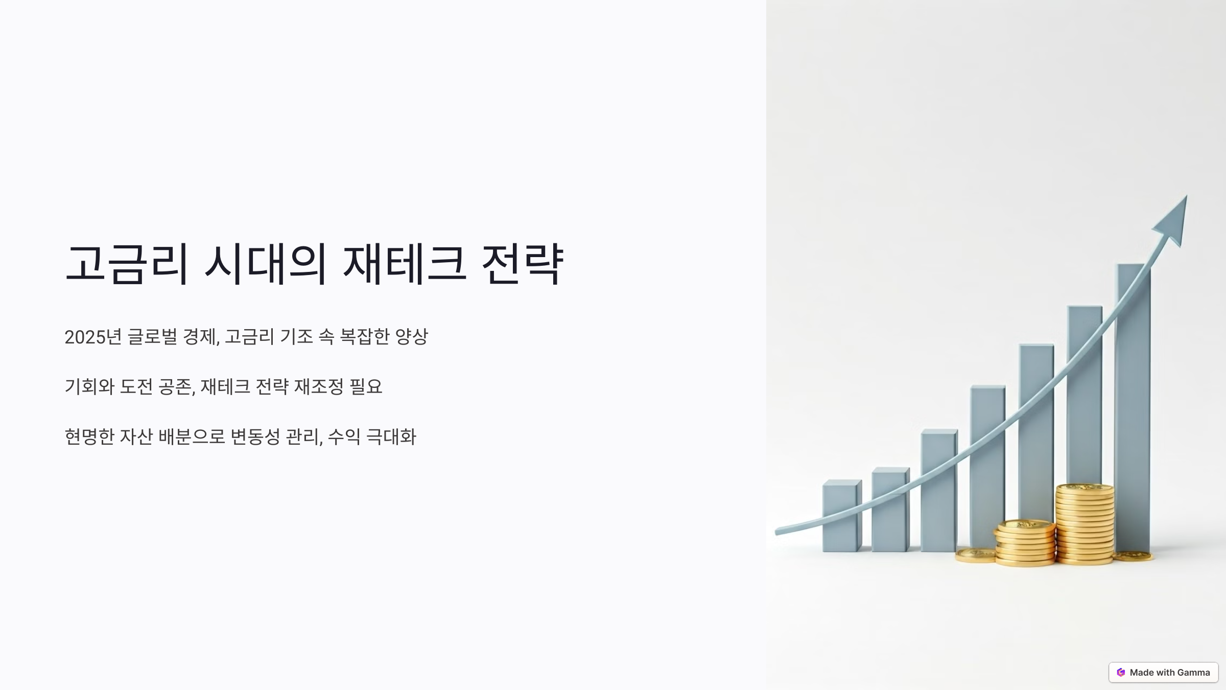 2025๋…„, ๊ธ€๋กœ๋ฒŒ ๊ฒฝ์ œ๋Š” ๊ณ ๊ธˆ๋ฆฌ ๊ธฐ์กฐ ์†์—์„œ ๋ณต์žกํ•œ ์–‘์ƒ์„ ๋ณด์ด๊ณ  ์žˆ์Šต๋‹ˆ๋‹ค. ๊ธˆ๋ฆฌ๊ฐ€ ์ƒ์Šนํ•˜๋ฉด ๋Œ€์ถœ ์ด์ž๋Š” ์ฆ๊ฐ€ํ•˜๊ณ  ์†Œ๋น„๋Š” ์œ„์ถ•๋˜์ง€๋งŒ, ๋™์‹œ์— ์ €์ถ•๊ณผ ์•ˆ์ „ ์ž์‚ฐ์˜ ๋งค๋ ฅ์ด ๋†’์•„์ง€๋Š” ๊ฒฝํ–ฅ์ด ์žˆ์Šต๋‹ˆ๋‹ค. ์ด๋Ÿฌํ•œ ๊ธˆ๋ฆฌ ์ƒ์Šน์€ ํˆฌ์ž์ž๋“ค์—๊ฒŒ ๊ธฐํšŒ์™€ ๋„์ „์„ ๋™์‹œ์— ์ œ๊ณตํ•˜๋ฉฐ, ์žฌํ…Œํฌ ์ „๋žต์˜ ์ „๋ฉด์ ์ธ ์žฌ์กฐ์ •์„ ์š”๊ตฌํ•ฉ๋‹ˆ๋‹ค. ๊ณ ๊ธˆ๋ฆฌ ์‹œ๋Œ€์— ์ž์‚ฐ์„ ํšจ๊ณผ์ ์œผ๋กœ ๊ด€๋ฆฌํ•˜๊ณ  ์„ฑ์žฅ์‹œํ‚ค๊ธฐ ์œ„ํ•ด์„œ๋Š” ๋ณ€๋™์„ฑ์„ ๊ด€๋ฆฌํ•˜๋ฉด์„œ ์ˆ˜์ต์„ ๊ทน๋Œ€ํ™”ํ•  ์ˆ˜ ์žˆ๋Š” ํ˜„๋ช…ํ•œ ์ž์‚ฐ ๋ฐฐ๋ถ„ ์ „๋žต์ด ํ•„์ˆ˜์ ์ž…๋‹ˆ๋‹ค. ๋ณธ ๊ธ€์—์„œ๋Š” ๊ณ ๊ธˆ๋ฆฌ ํ™˜๊ฒฝ์˜ ํŠน์ง•์„ ์‚ดํŽด๋ณด๊ณ , ์ด ์‹œ๊ธฐ์— ์ ํ•ฉํ•œ ํˆฌ์ž ์ „๋žต๊ณผ ์ž์‚ฐ ๋ฐฐ๋ถ„ ๋ฐฉ๋ฒ•์„ ์ œ์‹œํ•ฉ๋‹ˆ๋‹ค.