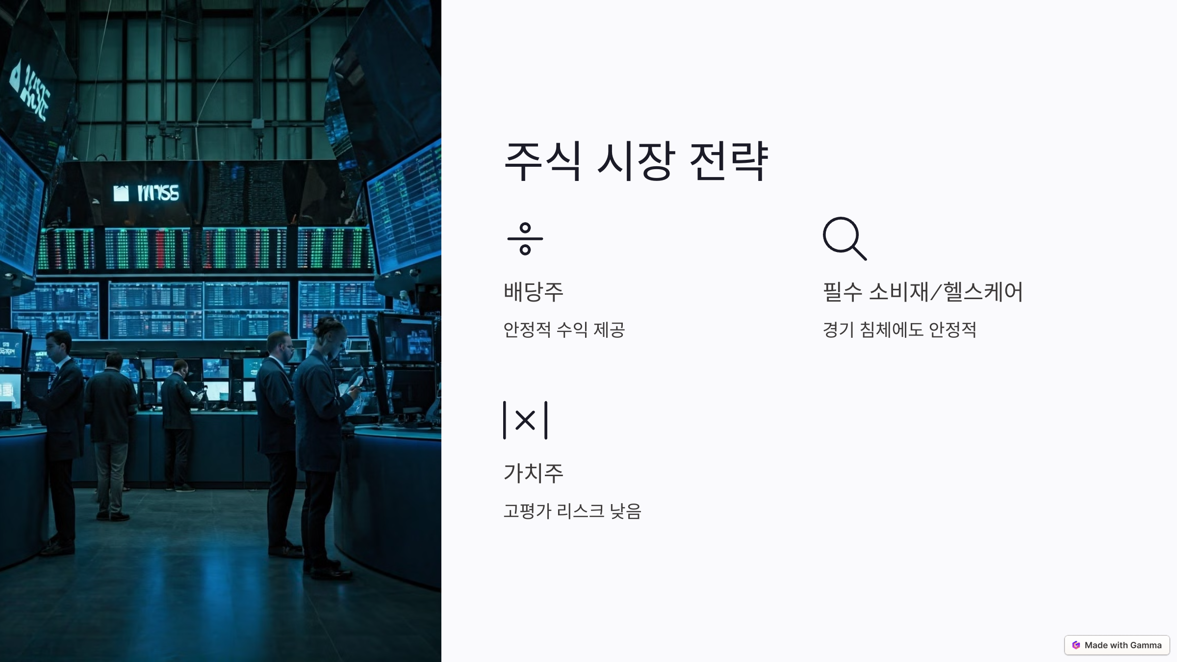 - ๊ฐ์น์ฃผ ์ค์ฌ ํฌ์: ๊ธ๋ฆฌ ์์น์ผ๋ก ์ฑ์ฅ์ฃผ์ ๋งค๋ ฅ์ด ๊ฐ์ํ๋ ๋ฐ๋ฉด, ๊ฐ์น์ฃผ๋ ๊ณ ํ๊ฐ ๋ฆฌ์คํฌ๊ฐ ๋ฎ์ ์์ ์ ์ธ ํฌ์ ์๋จ์ด ๋ ์ ์์ต๋๋ค.