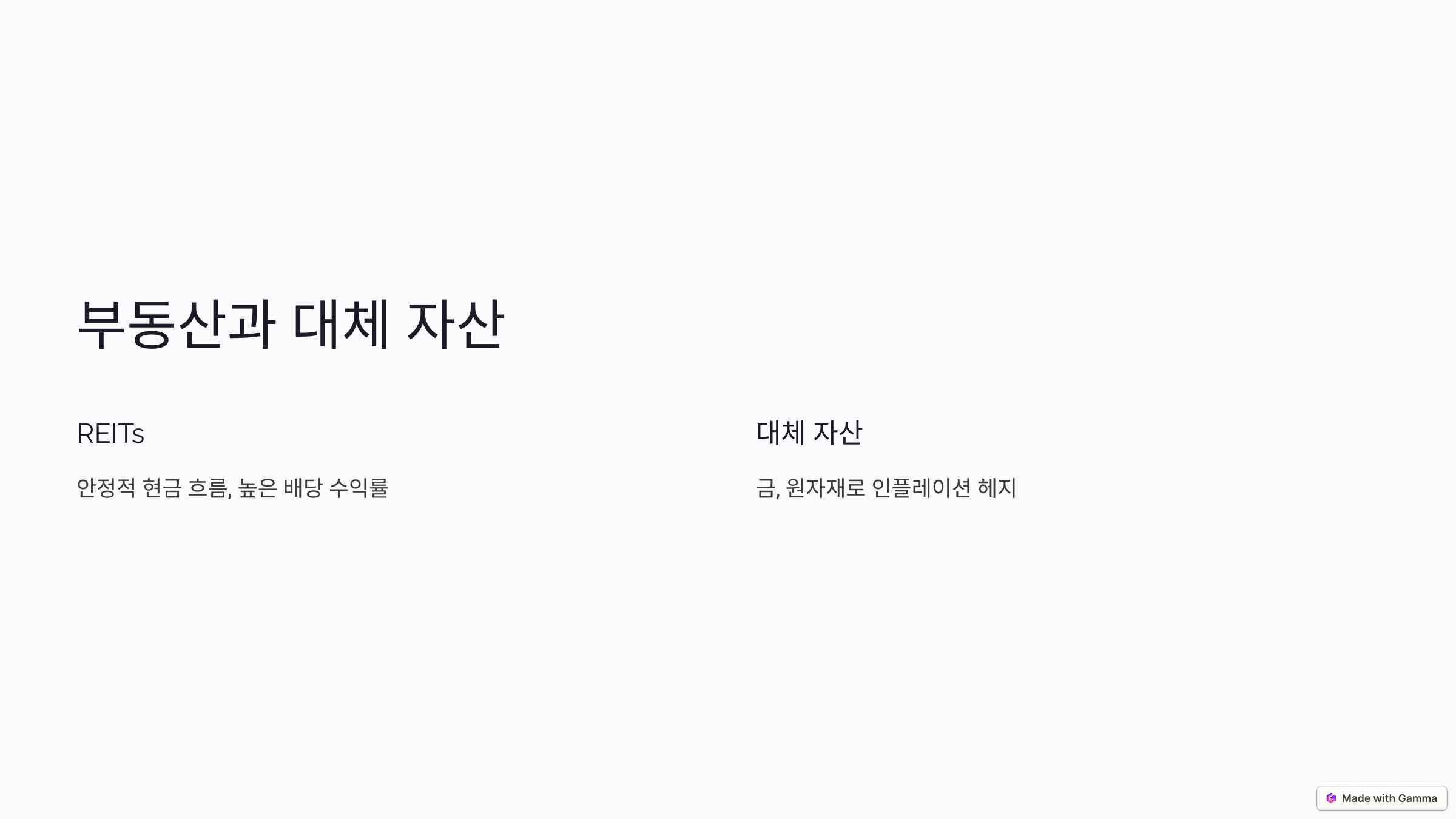 • REITs: ๋ถ€๋™์‚ฐ ํˆฌ์ž ์‹ ํƒ(REITs)์€ ๊ณ ๊ธˆ๋ฆฌ ํ™˜๊ฒฝ์—์„œ๋„ ๋ฐฐ๋‹น ์ˆ˜์ต๋ฅ ์ด ๋†’์€ ์ž์‚ฐ์œผ๋กœ ์•ˆ์ •์ ์ธ ํ˜„๊ธˆ ํ๋ฆ„์„ ์ œ๊ณตํ•ฉ๋‹ˆ๋‹ค. ํŠนํžˆ, ๋ฌผ๊ฐ€ ์ƒ์Šน๊ณผ ํ•จ๊ป˜ ์ž„๋Œ€๋ฃŒ๊ฐ€ ์ƒ์Šนํ•˜๋Š” ๊ตฌ์กฐ์˜ ๋ถ€๋™์‚ฐ์€ ๋งค๋ ฅ์ ์ธ ํˆฌ์ž ๋Œ€์ƒ์ด ๋  ์ˆ˜ ์žˆ์Šต๋‹ˆ๋‹ค.