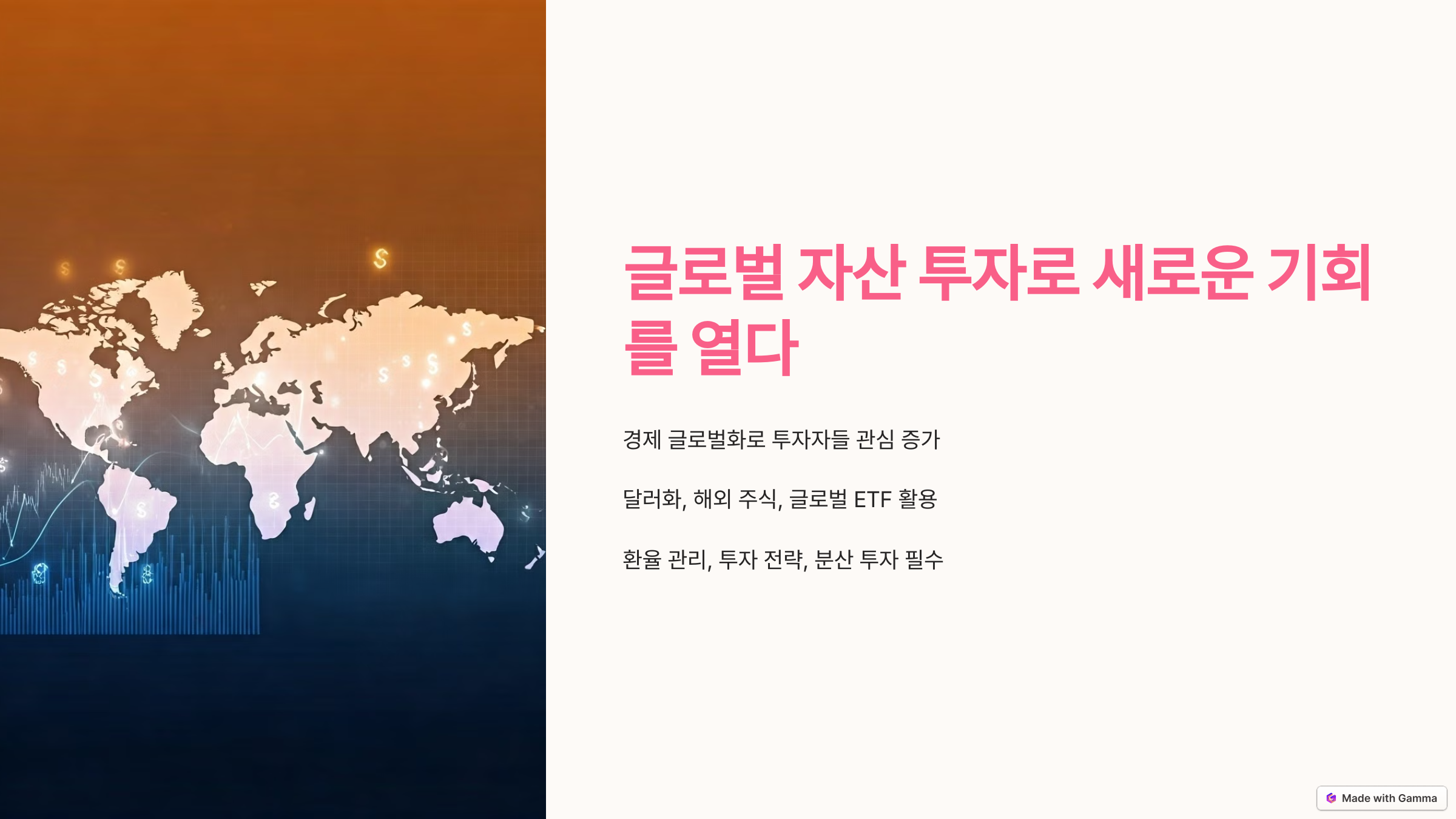 ๊ธ๋ก๋ฒ ์์ฐ ํฌ์๋ ๋จ์ํ ๊ตญ๋ด ์์ฅ์ ๋ณด์ํ๋ ๊ฒ์ ๋์ด, ๋ ๋์ ์ฑ์ฅ ๊ฐ๋ฅ์ฑ๊ณผ ์์ ์ฑ์ ์ ๊ณตํฉ๋๋ค. ์ฑ๊ณต์ ์ธ ํฌ์๋ฅผ ์ํด์๋ ํ์จ ๊ด๋ฆฌ์ ํด์ธ ์ฃผ์ ๋ฐ ๊ธ๋ก๋ฒ ETF๋ฅผ ํ์ฉํ ์ ๋ต์ ์ธ ํฌํธํด๋ฆฌ์ค ๊ตฌ์ฑ์ด ์ค์ํฉ๋๋ค.