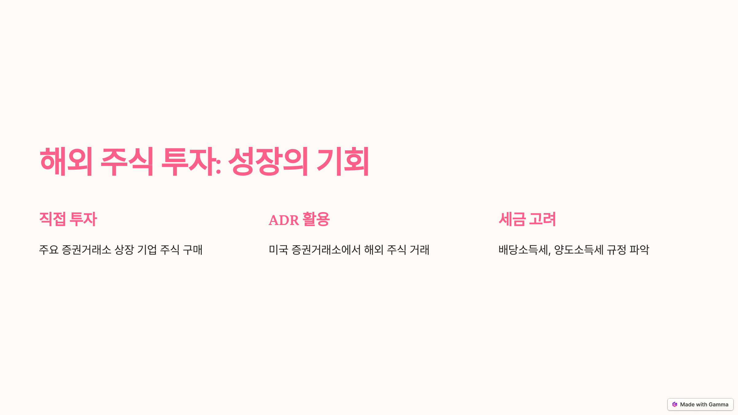 - ํฌ์ ์ ๊ณ ๋ ค์ฌํญ: ํด์ธ ์ฃผ์ ํฌ์ ์ ๋ฐฐ๋น์๋์ธ์ ์๋์๋์ธ๋ฅผ ๊ณ ๋ คํด์ผ ํ๋ฉฐ, ์ธ๊ธ ๊ด๋ จ ๊ท์ ์ ์ฌ์ ์ ํ์ ํด ์ธ์ ํํ์ ์ต๋ํ ํ์ฉํด์ผ ํฉ๋๋ค.