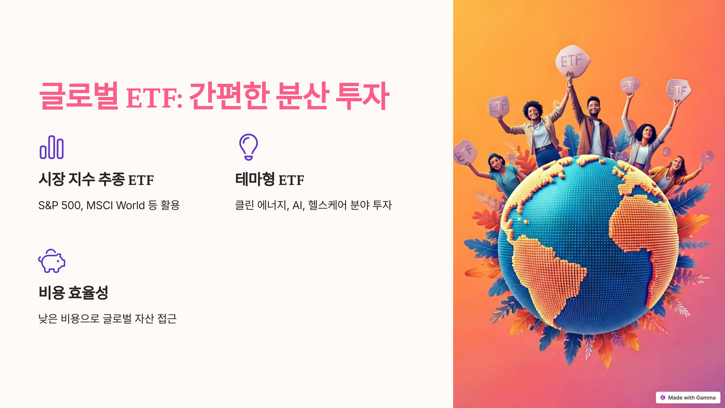 3. ๊ธ๋ก๋ฒ ETF ํ์ฉ: ๊ฐํธํ๊ณ ํจ๊ณผ์ ์ธ ๋ถ์ฐ ํฌ์