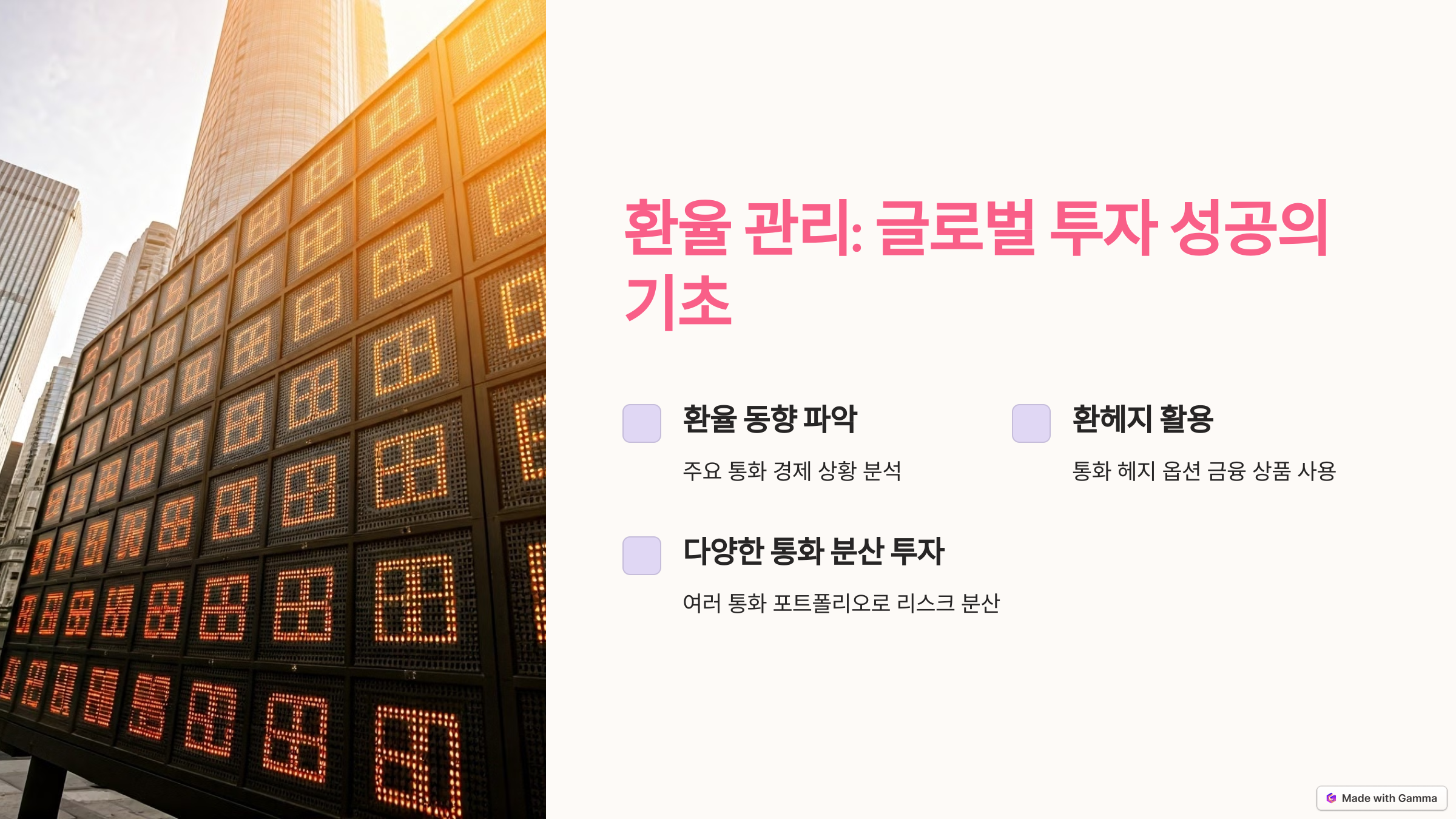 ๊ธ๋ก๋ฒ ํฌ์์์ ํ์จ์ ํฌ์ ์ฑ๊ณผ์ ํฐ ์ํฅ์ ๋ฏธ์น๋ ์์ธ์ ๋๋ค. ํ์จ ๋ณ๋์ ํด์ธ ์์ฐ์ ์ค์ ์์ต๋ฅ ์ ๊ฒฐ์ ์ง๊ธฐ ๋๋ฌธ์ ์ด๋ฅผ ์ฒ ์ ํ ๊ด๋ฆฌํด์ผ ํฉ๋๋ค.