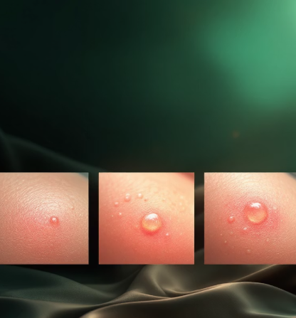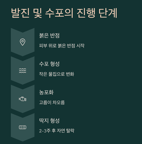 ์ดˆ๊ธฐ ํ†ต์ฆ์ด ์ง€๋‚˜๊ณ  ๋‚˜๋ฉด ํ”ผ๋ถ€ ์œ„๋กœ ๋ณ€ํ™”๊ฐ€ ์ƒ๊ธฐ๊ธฐ ์‹œ์ž‘ํ•ฉ๋‹ˆ๋‹ค. ๋ถ‰์€ ๋ฐ˜์ ์ด ์ƒ๊ธฐ๊ณ , ์ด๋‚ด ์ž‘์€ ๋ฌผ์ง‘์œผ๋กœ ๋ฐ”๋€Œ์–ด์š”. ์ด ์ˆ˜ํฌ๋Š” ๋ช‡ ์‹œ๊ฐ„ ์‚ฌ์ด์— ๊ณ ๋ฆ„์ด ์ฐจ๋Š” ๋†ํฌ๋กœ ์ง„ํ–‰๋˜๋ฉฐ, ์‹œ๊ฐ„์ด ์ง€๋‚˜๋ฉด์„œ ๋”ฑ์ง€๊ฐ€ ์ƒ๊ธฐ๊ณ  2~3์ฃผ์— ๊ฑธ์ณ ๋–จ์–ด์ง‘๋‹ˆ๋‹ค.