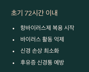 ๋Œ€์ƒํฌ์ง„์€ ์ดˆ๊ธฐ 72์‹œ๊ฐ„ ์ด๋‚ด ์น˜๋ฃŒ๊ฐ€ ๊ฐ€์žฅ ์ค‘์š”ํ•ด์š”. ์ด๋•Œ ํ•ญ๋ฐ”์ด๋Ÿฌ์Šค์ œ๋ฅผ ๋ณต์šฉํ•˜๋ฉด ๋ฐ”์ด๋Ÿฌ์Šค ํ™œ๋™์„ ์–ต์ œํ•˜๊ณ , ์‹ ๊ฒฝ ์†์ƒ์„ ์ค„์—ฌ์„œ ํ›„์œ ์ฆ์ธ ์‹ ๊ฒฝํ†ต์„ ์˜ˆ๋ฐฉํ•  ์ˆ˜ ์žˆ์ฃ . ๊ทธ๋Ÿฐ๋ฐ ๋Œ€๋ถ€๋ถ„ ์ดˆ๊ธฐ์— ๊ทธ๋ƒฅ ์ง„ํ†ต์ œ๋งŒ ๋จน๊ณ  ๋„˜๊ฒจ๋ฒ„๋ฆฌ๋Š” ๊ฒฝ์šฐ๊ฐ€ ๋งŽ์•„์š”. ์ˆ˜ํฌ๊ฐ€ ์ƒ๊ธฐ๊ธฐ ์ „์—๋„ ํ†ต์žฅ๋งŒ์œผ๋กœ ์ง„๋‹จ์ด ๊ฐ€๋Šฅํ•˜๋‹ˆ, ๋ณ‘์›์„ ๋ฏธ๋ฃจ์ง€ ๋งˆ์„ธ์š”.