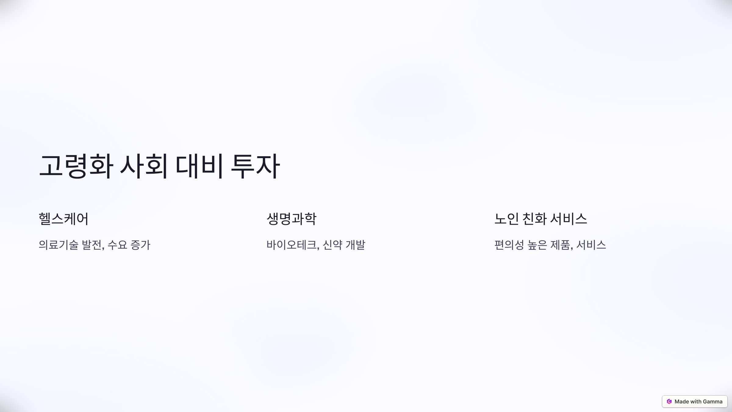๋ฏธ๋ž˜์—๋Š” ๊ณ ๋ นํ™” ์‚ฌํšŒ๊ฐ€ ๊ฐ€์†ํ™”๋˜๋ฉด์„œ ํ—ฌ์Šค์ผ€์–ด, ์ƒ๋ช…๊ณผํ•™, ์—ฐ๊ธˆ ๊ด€๋ จ ์‚ฐ์—…์ด ์ƒˆ๋กœ์šด ํˆฌ์ž ๊ธฐํšŒ๋กœ ๋ถ€์ƒํ•  ๊ฒƒ์ž…๋‹ˆ๋‹ค. ํŠนํžˆ ์˜๋ฃŒ ๊ธฐ์ˆ  ๋ฐ ๋…ธ์ธ ์นœํ™”์  ์„œ๋น„์Šค๋Š” ์ˆ˜์š” ์ฆ๊ฐ€์™€ ํ•จ๊ป˜ ๋†’์€ ์„ฑ์žฅ ๊ฐ€๋Šฅ์„ฑ์„ ์ง€๋‹ˆ๊ณ  ์žˆ์Šต๋‹ˆ๋‹ค. ์˜ˆ๋ฅผ ๋“ค์–ด, ๋ฐ”์ด์˜คํ…Œํฌ ๊ธฐ์—…์ด๋‚˜ ์˜๋ฃŒ ๊ธฐ๊ธฐ ์ œ์กฐ์—…์ฒด๋Š” ๊ณ ๋ นํ™” ์ธ๊ตฌ์˜ ์ฆ๊ฐ€๋กœ ์ธํ•ด ์•ˆ์ •์ ์ธ ์ˆ˜์ต์„ ์ฐฝ์ถœํ•  ๊ฐ€๋Šฅ์„ฑ์ด ๋†’์Šต๋‹ˆ๋‹ค.