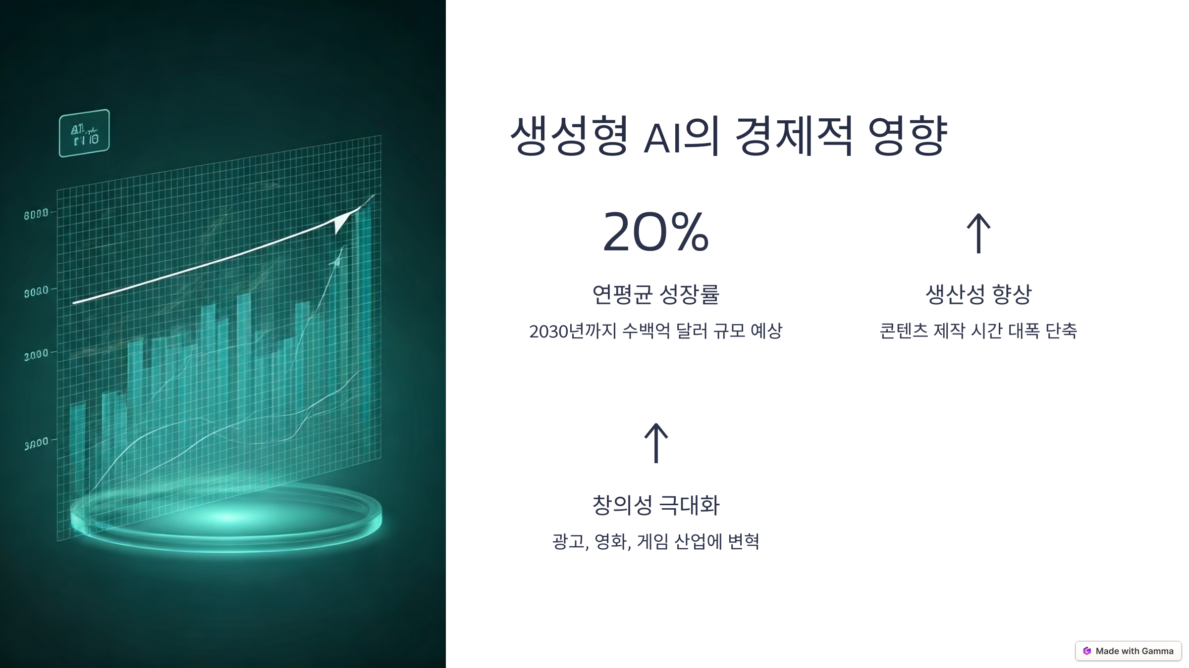 μƒμ„±ν˜• AIλŠ” λ‹¨μˆœν•œ 기술적 ν˜μ‹ μ„ λ„˜μ–΄, 생산성과 μ°½μ˜μ„±μ„ κ·ΉλŒ€ν™”ν•˜λ©° 경제 ꡬ쑰에 μ€‘μš”ν•œ λ³€ν™”λ₯Ό μΌμœΌν‚€κ³  μžˆμŠ΅λ‹ˆλ‹€. 예λ₯Ό λ“€μ–΄, ν…μŠ€νŠΈ 생성 AIλŠ” μ½˜ν…μΈ  μ œμž‘ μ‹œκ°„μ„ λŒ€ν­ λ‹¨μΆ•μ‹œμΌœ 언둠사, λ§ˆμΌ€νŒ… μ—μ΄μ „μ‹œ, μΆœνŒμ—…κ³„ λ“±μ—μ„œ ν™œμš©λ˜κ³  있으며, 이미지 생성 AIλŠ” κ΄‘κ³ , μ˜ν™”, κ²Œμž„ 산업에 λ³€ν˜μ„ κ°€μ Έμ˜€κ³  μžˆμŠ΅λ‹ˆλ‹€.