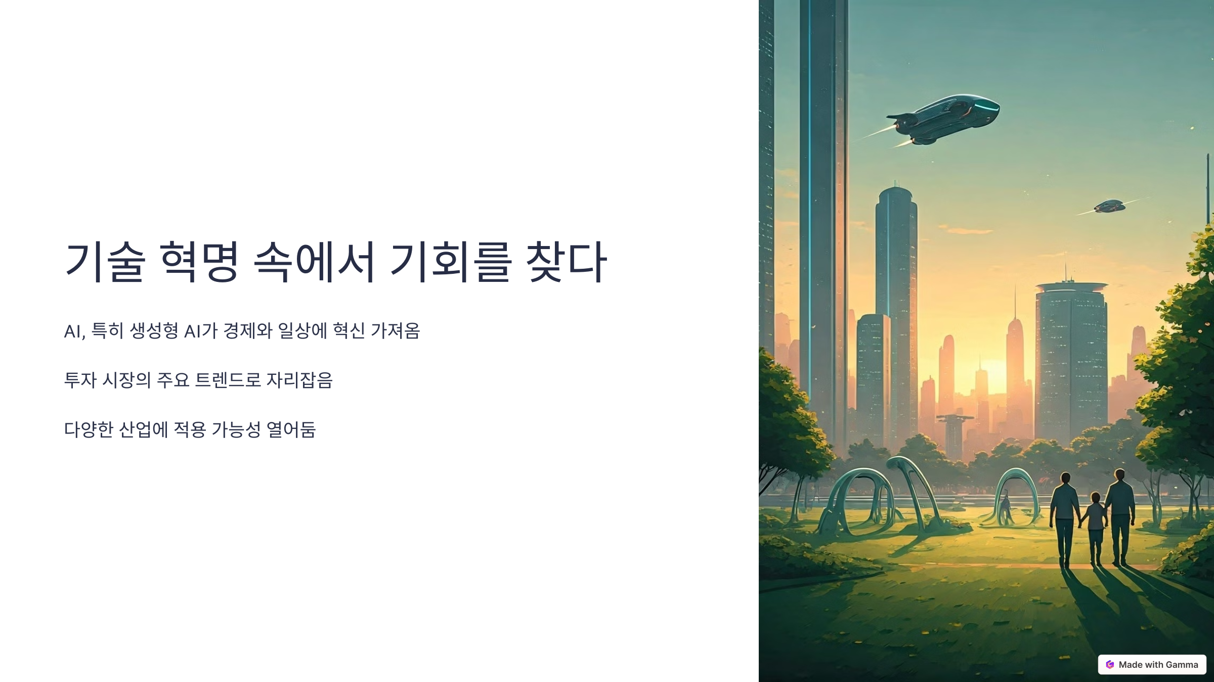 μƒμ„±ν˜• AIλŠ” κ²½μ œμ™€ 기술의 μƒˆλ‘œμš΄ ꡭ면을 μ—΄λ©°, νˆ¬μžμžλ“€μ—κ²Œ μœ λ§ν•œ 기회λ₯Ό μ œκ³΅ν•©λ‹ˆλ‹€. 이 κΈ°μˆ μ€ μ½˜ν…μΈ  μ œμž‘, ν—¬μŠ€μΌ€μ–΄, 금육 λ“± λ‹€μ–‘ν•œ λΆ„μ•Όμ—μ„œ ν˜μ‹ μ„ μ£Όλ„ν•˜κ³  있으며, 이λ₯Ό ν™œμš©ν•œ 기업듀은 높은 μ„±μž₯ κ°€λŠ₯성을 보여주고 μžˆμŠ΅λ‹ˆλ‹€.