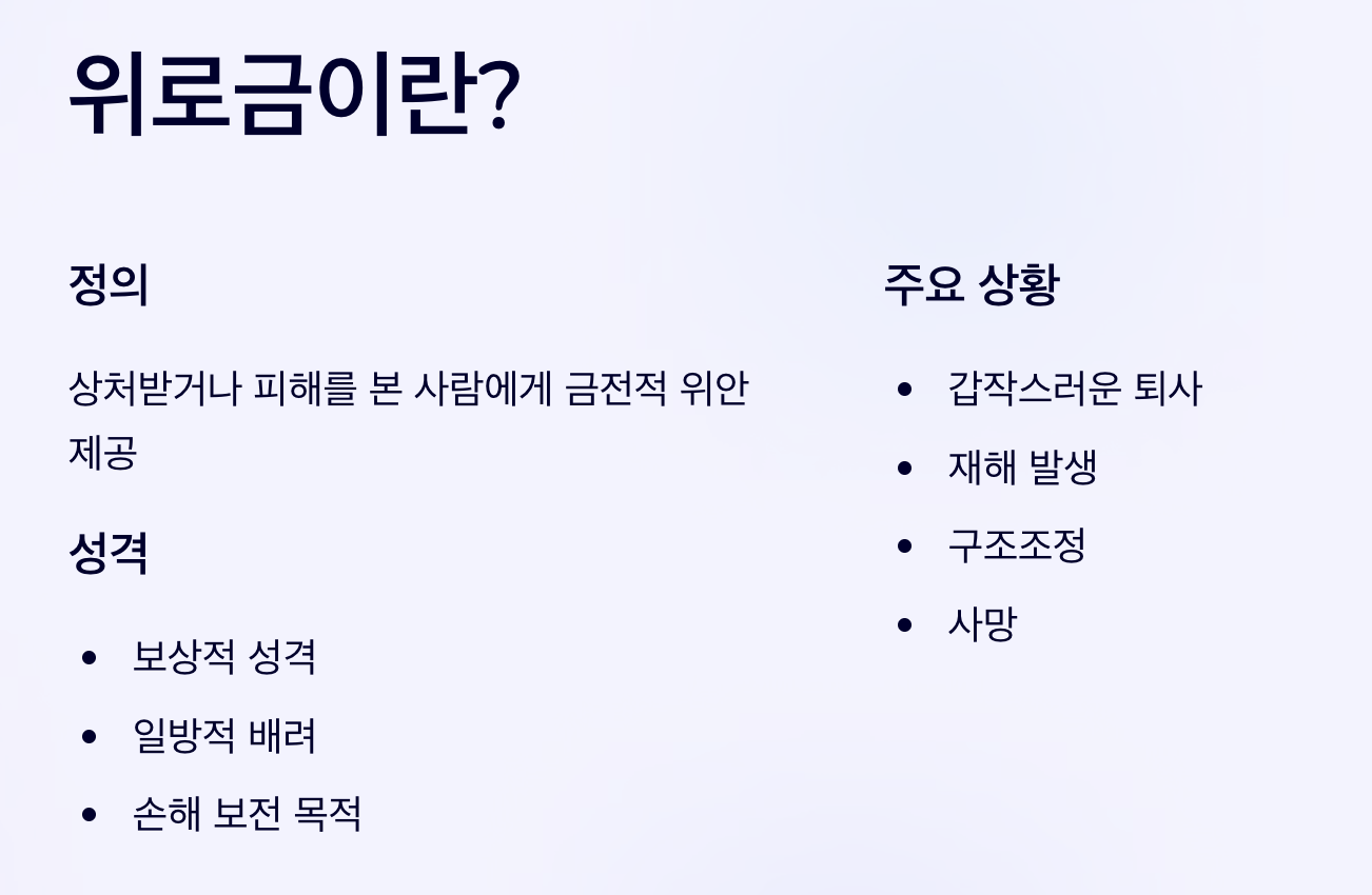 ์œ„๋กœ๊ธˆ์€ ๋ง ๊ทธ๋Œ€๋กœ ์œ„๋กœ์˜ ์˜๋ฏธ๋ฅผ ๋‹ด์€ ๋ˆ์ด์—์š”. ์–ด๋–ค ์‚ฌ๊ฑด์ด๋‚˜ ์ƒํ™ฉ ๋•Œ๋ฌธ์— ์ƒ์ฒ˜๋ฐ›๊ฑฐ๋‚˜ ํ”ผํ•ด๋ฅผ ๋ณธ ์‚ฌ๋žŒ์—๊ฒŒ, ๊ธˆ์ „์ ์œผ๋กœ๋‚˜๋งˆ ์กฐ๊ธˆ์ด๋ผ๋„ ์œ„์•ˆ์„ ์ฃผ๊ธฐ ์œ„ํ•ด ์ง€๊ธ‰๋˜๋Š” ๊ฑฐ์ฃ . ๋ณด์ƒ์ ์ธ ์„ฑ๊ฒฉ์ด ๊ฐ•ํ•˜๊ณ , ๋Œ€๋ถ€๋ถ„ ์ผ๋ฐฉ์ ์ธ ๋ฐฐ๋ ค์˜ ์ฐจ์›์—์„œ ์ง€๊ธ‰๋ผ์š”. ์˜ˆ๋ฅผ ๋“ค์–ด, ๊ฐ‘์ž‘์Šค๋Ÿฌ์šด ํ‡ด์‚ฌ๋‚˜ ์žฌํ•ด๋กœ ์–ด๋ ค์›€์„ ๊ฒช๋Š” ์ง์›์—๊ฒŒ ์ง€๊ธ‰๋ฉ๋‹ˆ๋‹ค.
