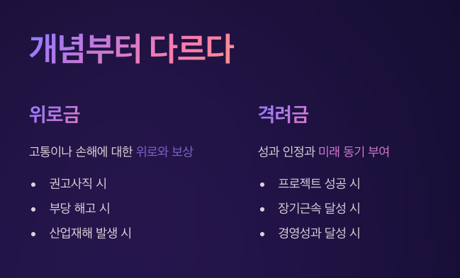 ์๋ฅผ ๋ค์ด๋ณผ๊ฒ์. ์ด๋ค ์ง์์ด ํ๋ก์ ํธ ์ฑ๊ณต ํ ๋ฐ์ 200๋ง ์์ด ์์ด์. ์ด๊ฑด ๊ฒฉ๋ ค๊ธ์ ๋๋ค. ๋ฐ๋๋ก, ์ด๋ค ์ง์์ด ์ฐ์ ์ฌํด ์ดํ ๋ฐ์ 300๋ง ์์? ์๋ก๊ธ์ด์ฃ . ๋ ๋ค ํ์ฌ์์ ์ค ๋์ด์ง๋ง "์ฑ๊ณผ์ ๋ํ ๋ณด์"์ธ์ง "๊ณ ํต์ ๋ํ ๋ณด์"์ธ์ง๋ง ๋ด๋ ํ์ฐํ ๋ฌ๋ผ์ง๋๋ค.