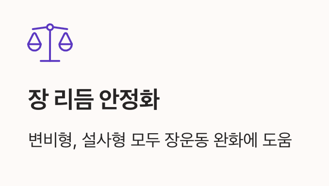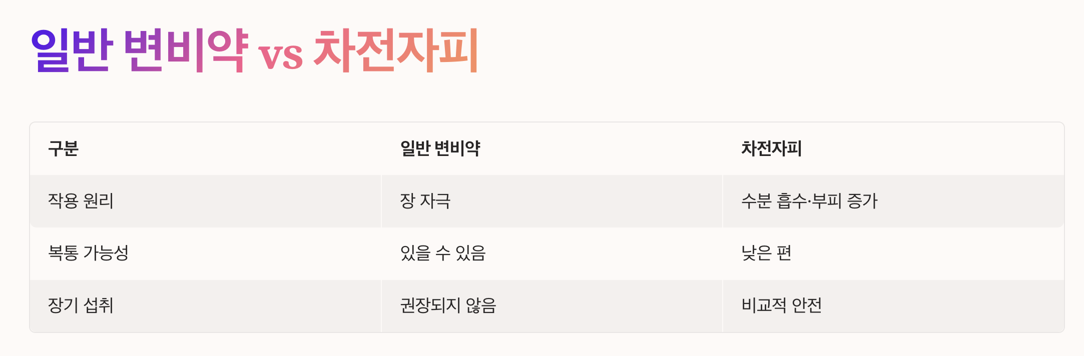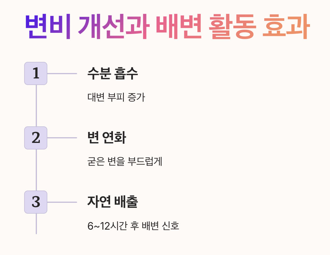 ์ฐจ์ ์ํผ ํจ๋ฅ ์ค ๊ฐ์ฅ ๋ํ์ ์ธ ํจ๊ณผ๋ ๋ณ๋น ๊ฐ์ ์ ๋๋ค. ์ฅ ์์์ ์๋ถ์ ํก์ํด ๋๋ณ์ ๋ถํผ๋ฅผ ๋๋ฆฌ๊ณ , ๊ตณ์ด ์๋ ๋ณ์ ๋ถ๋๋ฝ๊ฒ ๋ง๋ค์ด ์์ฐ์ค๋ฌ์ด ๋ฐฐ์ถ์ ๋์ต๋๋ค. ์ด ๊ณผ์ ์ ์ฅ์ ์ง์ ์๊ทนํ๋ ๋ฐฉ์์ด ์๋๋ผ, ์ฅ์ด ์ค์ค๋ก ์์ง์ด๋๋ก ์ ๋ํ๋ ํํ๋ผ ๋น๊ต์ ์ํ๊ฒ ์์ฉํฉ๋๋ค.