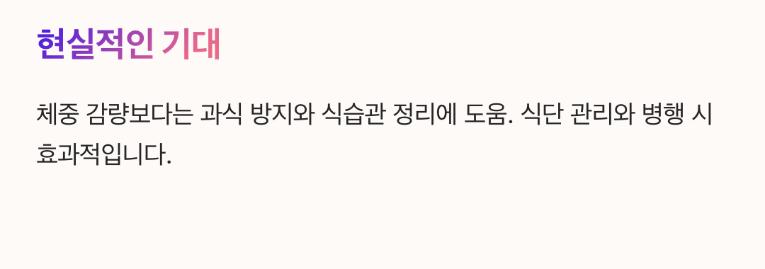 ๋ค๋ง ์ฒด์ค ๊ฐ๋ ํจ๊ณผ๋ฅผ ๊ธฐ๋ํ๊ธฐ๋ณด๋ค๋, ๊ณผ์์ ์ค์ด๊ณ ์์ต๊ด์ ์ ๋ฆฌํ๋ ๋ฐ ๋์์ ์ค๋ค๊ณ ์๊ฐํ๋ ๊ฒ์ด ํ์ค์ ์ ๋๋ค. ์๋จ ๊ด๋ฆฌ์ ํจ๊ป ๋ณํํ ๋ ํจ๊ณผ๋ฅผ ์ฒด๊ฐํ๊ธฐ ์ฌ์ด ํธ์ ๋๋ค.