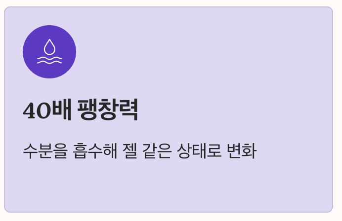 ์ฐจ์ ์ํผ๋ ์ง๊ฒฝ์ด ์จ์์ ๊ป์ง์ ๋ถ๋ฆฌํด ๋ง๋ ์ฒ์ฐ ์์ด์ฌ์ ์ ๋๋ค. ๊ฐ๋ฃจ ํํ๋ก ์ญ์ทจํ์ง๋ง, ๋ฌผ์ ๋ง๋๋ฉด ์ฑ์ง์ด ์์ ํ ๋ฌ๋ผ์ง๋๋ค. ์๋ถ์ ํก์ํด ์ต๋ 40๋ฐฐ๊น์ง ํฝ์ฐฝํ๋ฉด์ ์ ค ๊ฐ์ ์ํ๋ก ๋ณํ๊ณ , ์ด ํน์ฑ์ด ์ฅ ์์์ ์ค์ํ ์ญํ ์ ํ๊ฒ ๋ฉ๋๋ค.