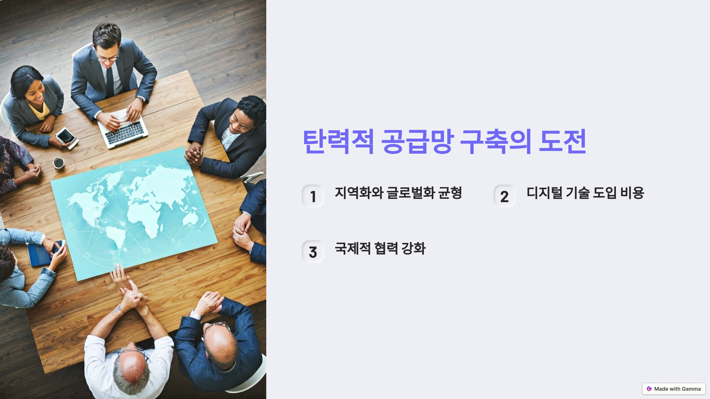 ๊ณผ ํ์ ์ ํตํด ๊ณต๊ธ๋ง์ ์ ์ฐ์ฑ์ ๋์ฌ์ผ ํฉ๋๋ค. ๋ํ, ๊ตญ์ ์ฌํ๋ ์ํธ ์์กด์ ์ธ ๊ฒฝ์ ๊ตฌ์กฐ๋ฅผ ๊ณ ๋ คํ์ฌ ํ๋ ฅ๊ณผ ์กฐํ๋ฅผ ๊ธฐ๋ฐ์ผ๋ก ํ ๊ณต๊ธ๋ง ์ฌํธ์ ๋์์ผ ํฉ๋๋ค.