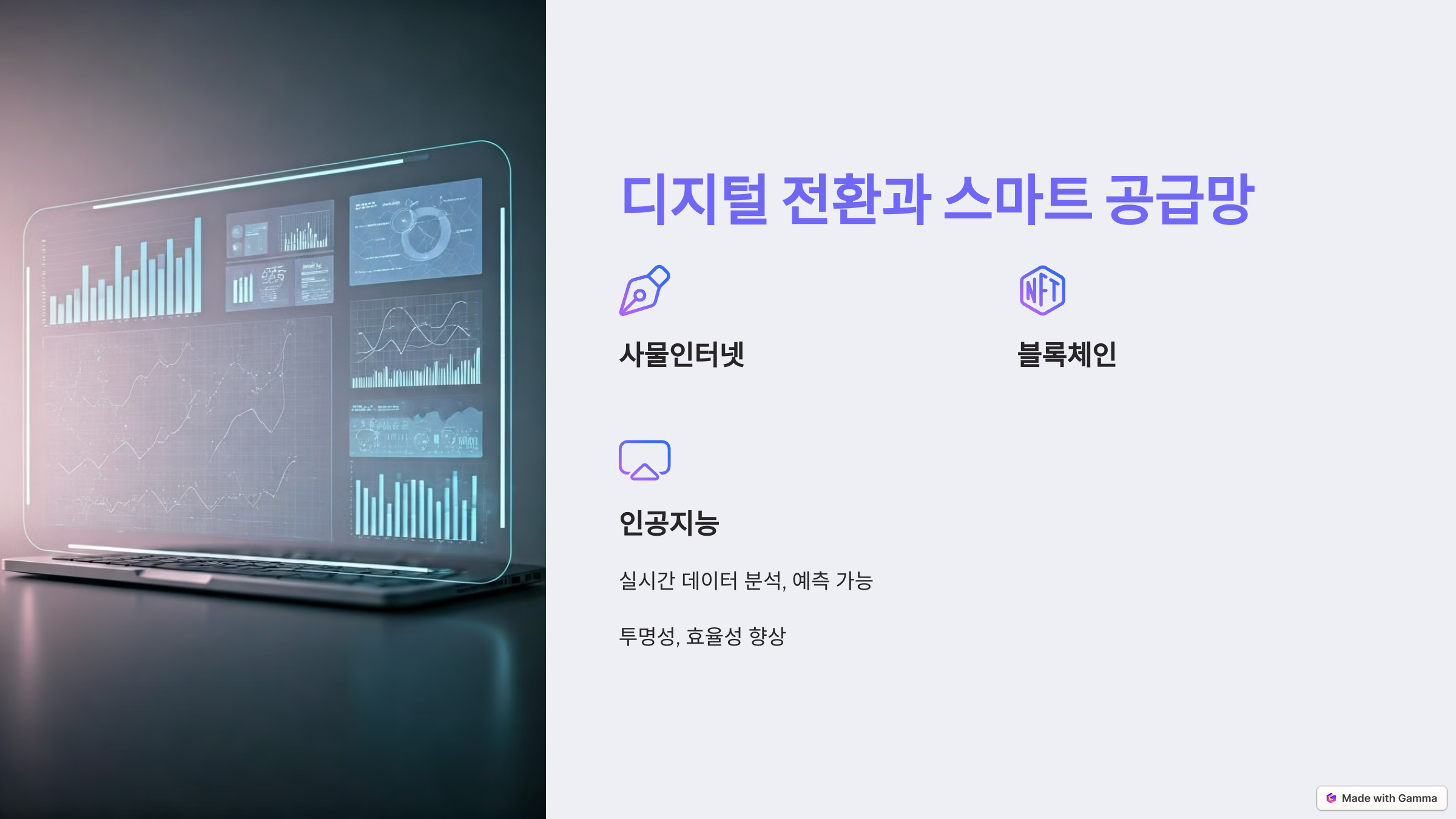 ๋์งํธ ๊ธฐ์ ์ ๊ธ๋ก๋ฒ ๊ณต๊ธ๋ง ์ฌ๊ตฌ์ถ์ ํต์ฌ ์์๋ก ๋ถ์ํ๊ณ ์์ต๋๋ค. ์ฌ๋ฌผ์ธํฐ๋ท(IoT), ๋ธ๋ก์ฒด์ธ, ์ธ๊ณต์ง๋ฅ(AI) ๋ฑ์ ๊ธฐ์ ์ ์ค์๊ฐ ๋ฐ์ดํฐ ๋ถ์๊ณผ ์์ธก์ ๊ฐ๋ฅํ๊ฒ ํ๋ฉฐ, ๊ณต๊ธ๋ง ๊ด๋ฆฌ์ ํฌ๋ช
