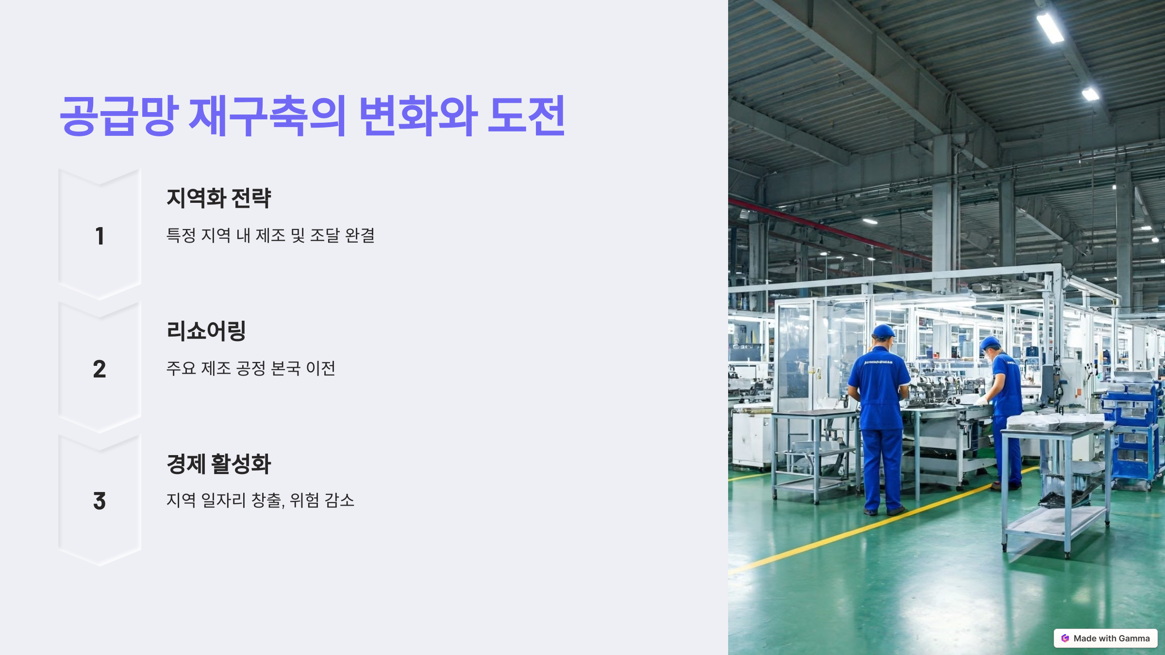 ์ง์ญํ๋ ๊ณต๊ธ๋ง์ ํ๋ณต๋ ฅ์ ๋์ด๋ ๋์์, ๊ฐ๊ตญ์ ๊ฒฝ์ ํ์ฑํ์๋ ๊ธฐ์ฌํ ์ ์์ต๋๋ค. ์๋ฅผ ๋ค์ด, ๋ฏธ๊ตญ๊ณผ ์ ๋ฝ์์๋ ์ฃผ์ ์ ์กฐ ๊ณต์ ์ ๋ณธ๊ตญ์ผ๋ก ์ด์ ํ๊ฑฐ๋ ์ธ๊ทผ ์ง์ญ์ผ๋ก ์ฎ๊ธฐ๋ ๋ฆฌ์ผ์ด๋ง(Reshoring)์ด ํ๋ฐํ ๋